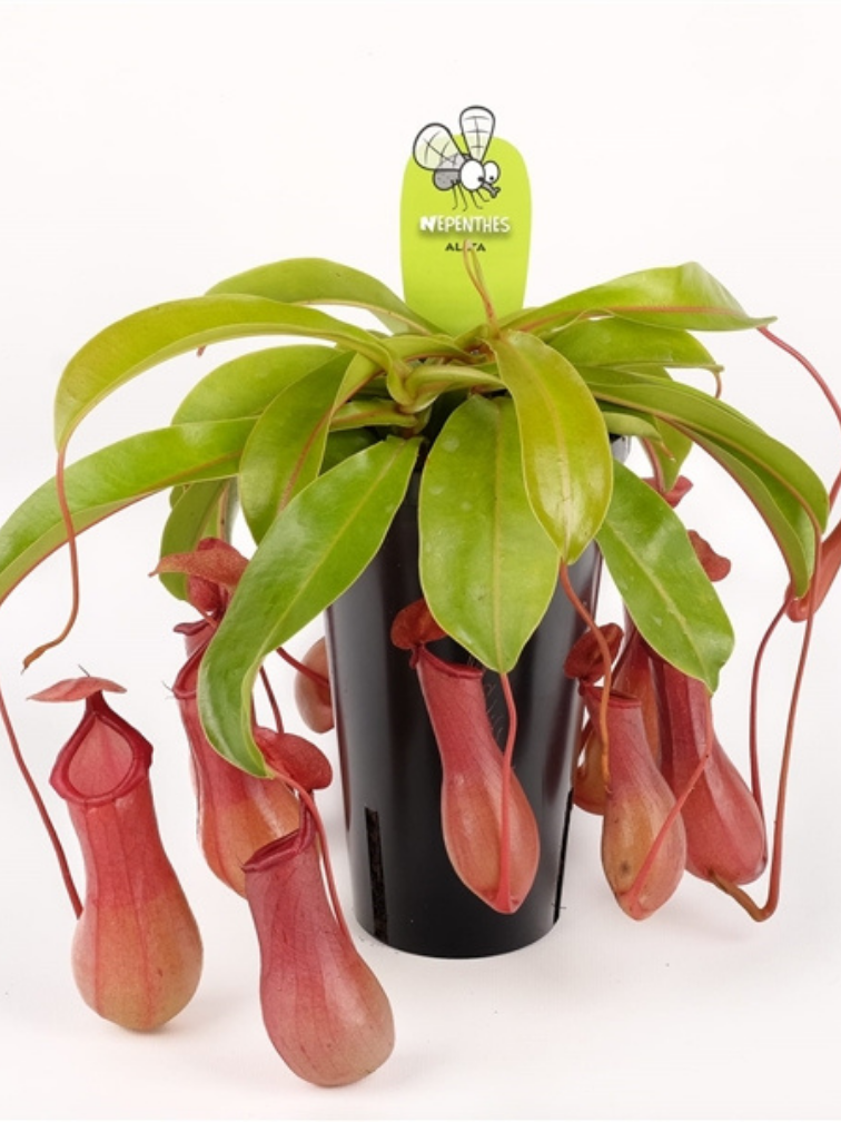 De Bekerplant "Alata" (Nepenthes): Deze grote Bekerplant heeft mooie, grote rode/groene bekers. De Nepenthes Alata lokt insecten middels haar prachtige bekers. Aan de beker bevindt zich een heerlijke zoete vloeistof die insecten lokt. De bekers bevatten een vloeistof met enzymen die vervolgens insecten verteren. De Bekerplant is een vrij zeldzame vleesetende plant en komt oorspronkelijk uit de jungles van Borneo.